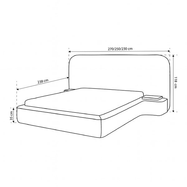 Integralną częścią podstawy łóżka Genz są dwa eleganckie stoliki nocne z blatami wykonanymi z drewna orzechowego. To rozwiązanie podkreśla naturalny charakter projektu, wprowadzając ciepły, organiczny akcent do całej kompozycji. Drewniane elementy doskonale harmonizują z tapicerką bouclé, tworząc spójną całość inspirowaną naturą i autentycznością. Stoliki nocne nie tylko dodają funkcjonalności, ale także stają się ozdobą sypialni, będąc miejscem na książkę, lampkę czy poranną kawę.