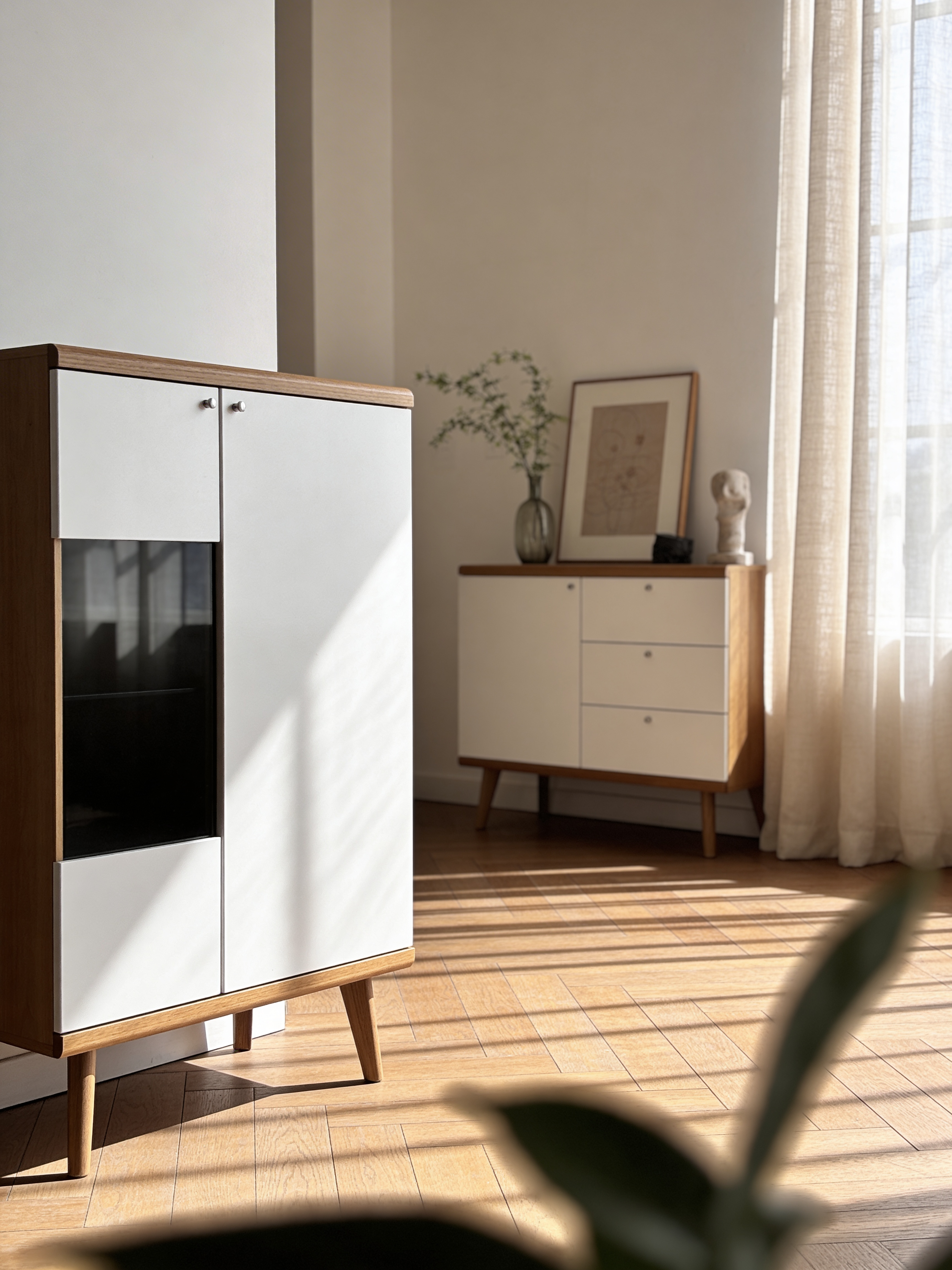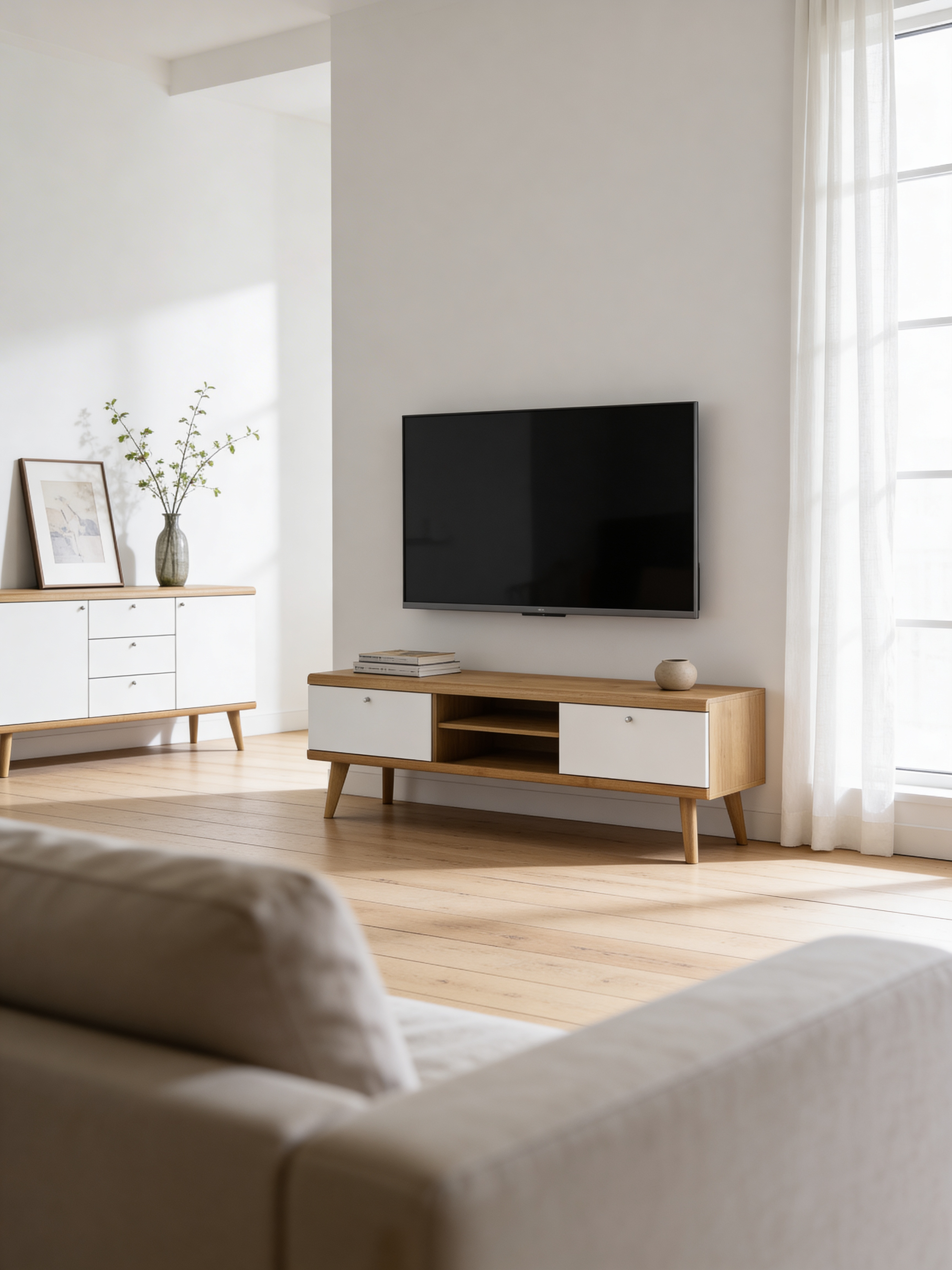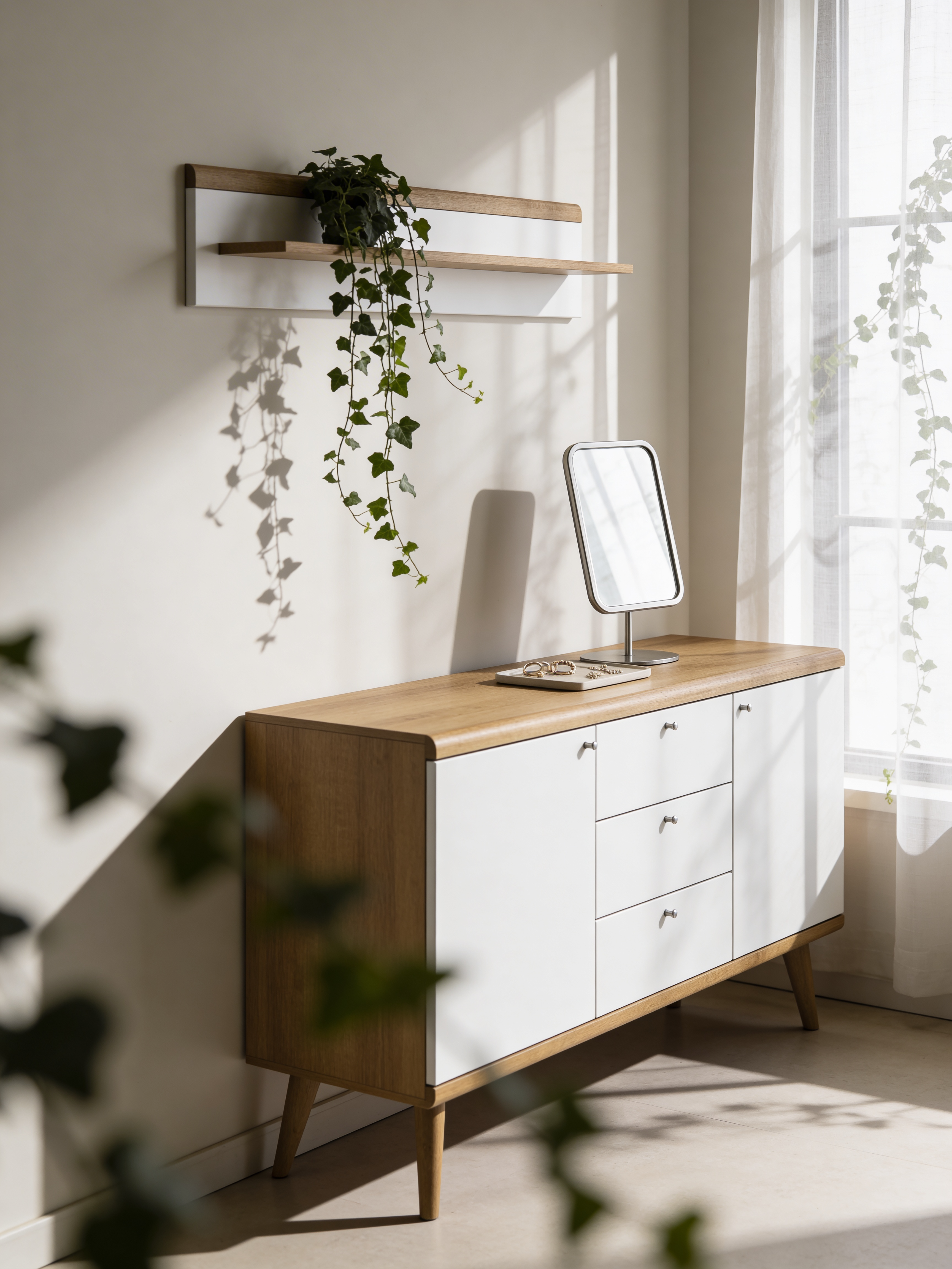To styl skandynawski z nowoczesnym akcentem – proste formy, naturalne materiały, subtelne uchwyty i brak zbędnych ozdobników. Kolekcja łączy minimalizm z przytulnością.